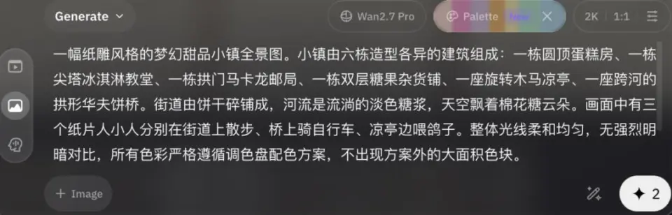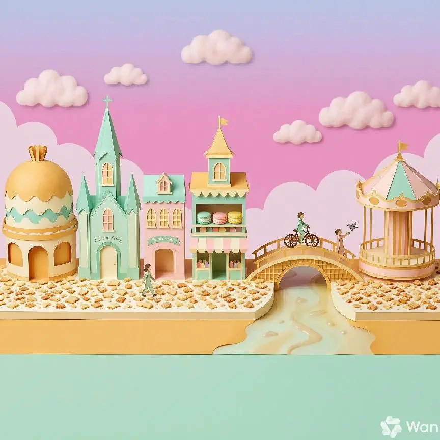 可以看到,Wan2.7-Image生成的图片无论是在色彩准确度还是比例上,都完美遵循了调色盘的原始配比,纸雕风格也栩栩如生,图片中的建筑、凉亭等边缘完美保留了卡纸的粗粝质感。