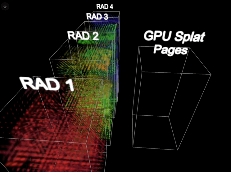 Spark 2.0 将这一机制引入到 3DGS 中,在 GPU 上分配一个固定容量(约 1600 万 splat)的内存池,并自动管理 GPU 中 64K splat 的「页」与 .RAD 文件中对应的 64K 数据块之间的映射关系。