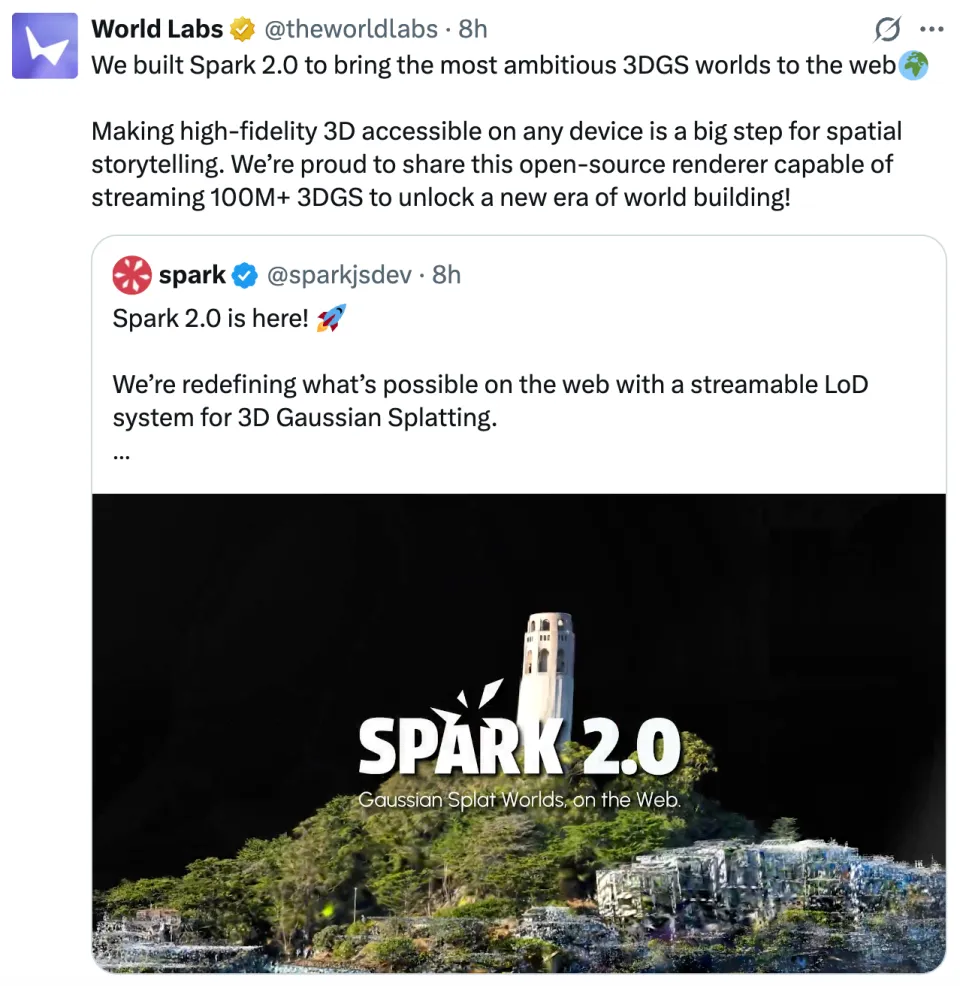 就在今天凌晨,李飞飞空间智能独角兽公司 World Labs 官宣推出「Spark 2.0」,将最具野心的 3DGS(3D 高斯泼溅)世界带入到 Web。
