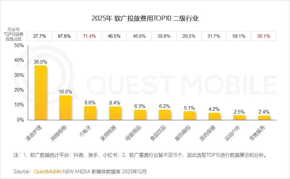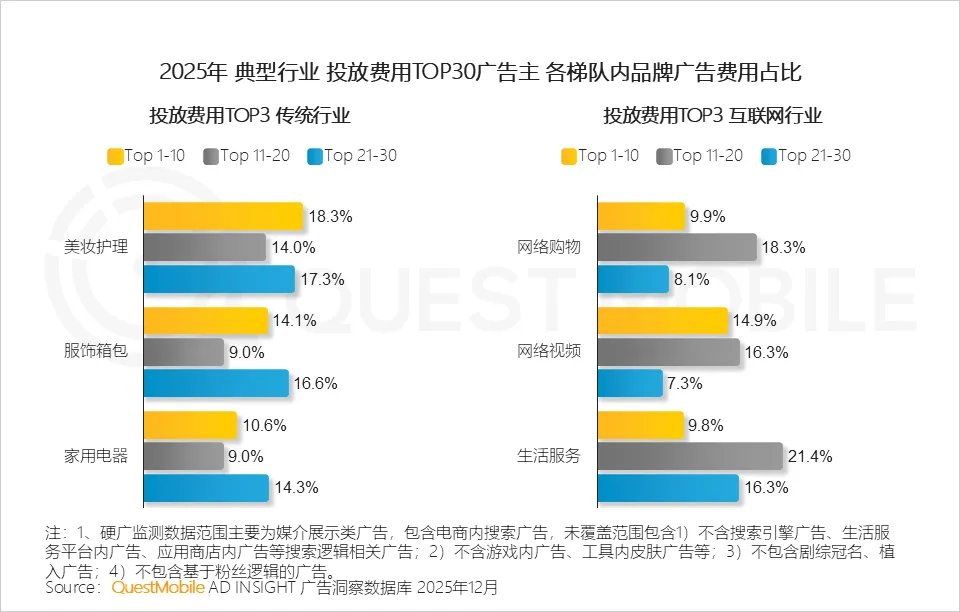从硬广投放费用占比看,美妆护理行业持续断层式领先;综合行业内TOP10品牌集中度看,传统行业呈现大体量、低集中度的投放特征,中小及新锐品牌仍拥有活跃与突围空间;而互联网行业则表现出极高的集中态势,头部效应显著。