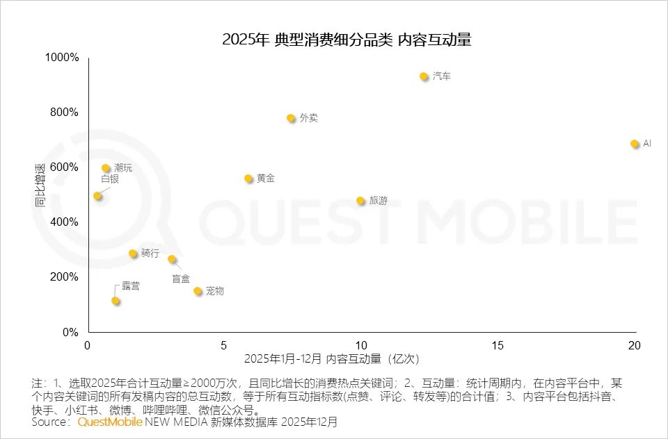1.3 内容互动与实物消费高度相关,AI与汽车是内容流量双引擎,体验型、服务型消费内容热度攀升