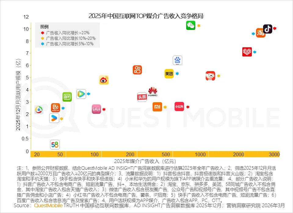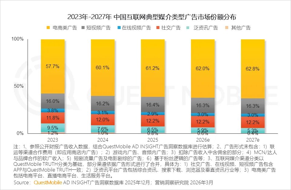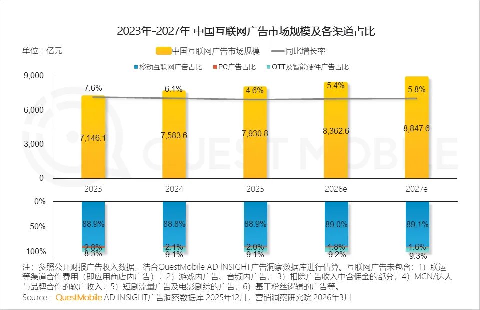继续咱们的每周深度解读😎今天给大家分享一下2025年中国营销市场年度报告。QuestMobile数据显示,过去三年,随着相关部门持续推进平台经济与算法监管、数据安全与隐私保障,互联网营销的发展日趋健康,规模和韧性都得到了显著提升,互联网广告市场规模从2023年的7146.1亿元增长至2025年的7930.8亿元,预计2026年、2027年将分别达到8362.6亿元、8847.6亿元。