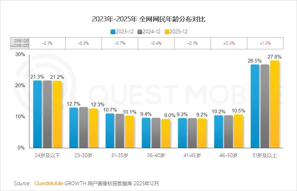 互联网广告增长的韧性,一方面是由经济的持续稳态复苏驱动,2025年社会消费品零售总额达到50.1万亿元,用户消费偏好也发生了结构性的变化,刚需囤货类与兴趣情绪类出现了较快速提升;另一方面,则与网民年龄结构变化有关,2025年全网网民年龄分布中,46岁以上用户占比达到38.3%,相比2023年增加了1.6%,成为主要增量,相应的带来了消费习惯的变化。