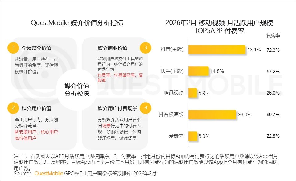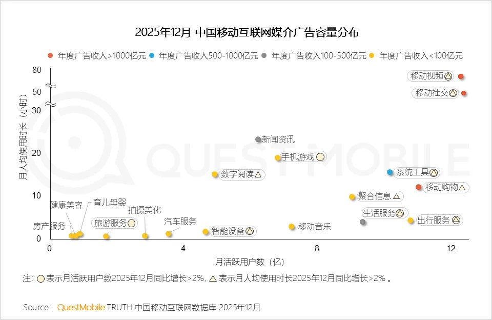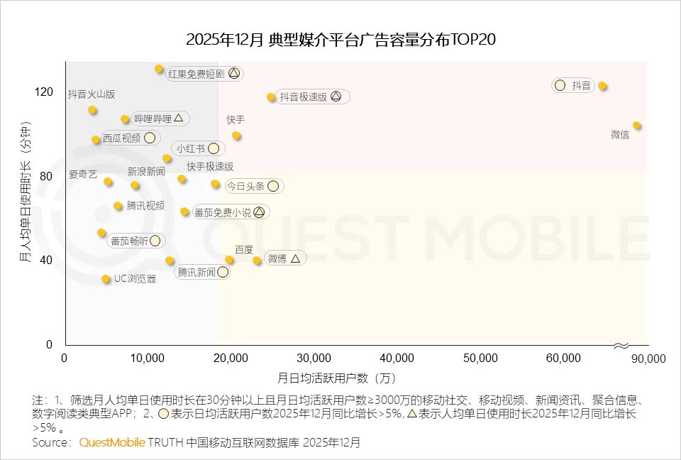 QuestMobile数据显示,2025年,抖音平台中,广告主将更多预算投放至影视娱乐、生活、科技数码等达人;小红书平台中,广告主投放结构变化不大。