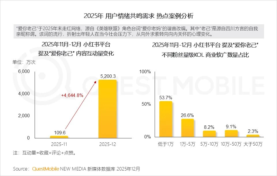 “爱你老己”的爆火反应出用户对内求、自爱情绪的情绪共鸣和价值认可,而在传播主体上,品牌也以去中心化的KOC传播方式,力求带动更多用户的情绪共振点。