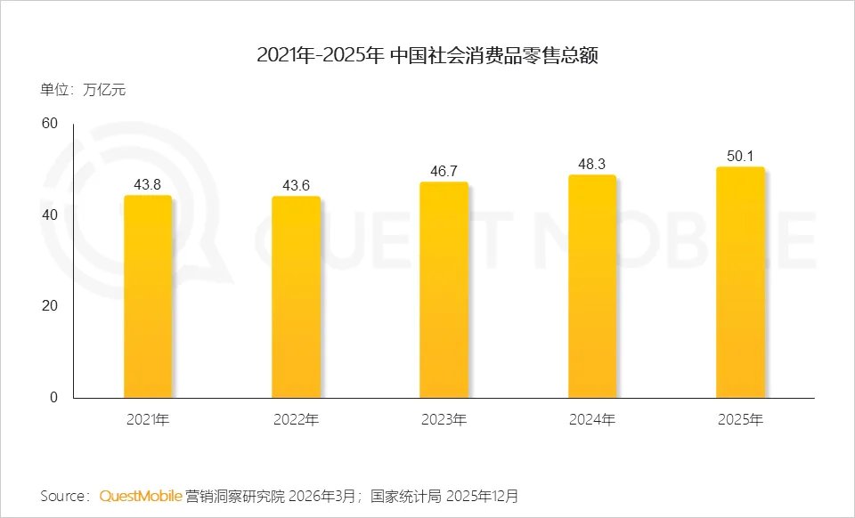 “十四五”时期,社会消费品零售总额先后迈进40万亿元、50万亿元新台阶。2025年,社会消费品零售总额达50.1万亿元,同比增长3.7%。