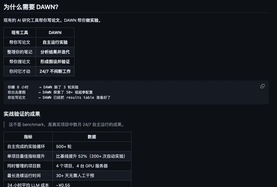 自主完成500+轮实验循环,单个项目指标比 baseline 提升 52%(200+ 次全自动实验跑出来的),同时管理 4 个项目、4 台 GPU 服务器,最长连续运行 30+ 天,期间人类只介入了五六次