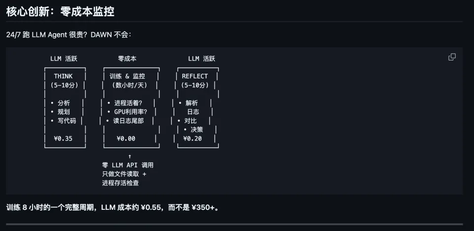 一天24小时里,90%以上的时间都在训练,这段时间 LLM 调用费 = 0。只有开头「想方案」和结尾「看结果」才需要请大模型出马,每次几分钟。
