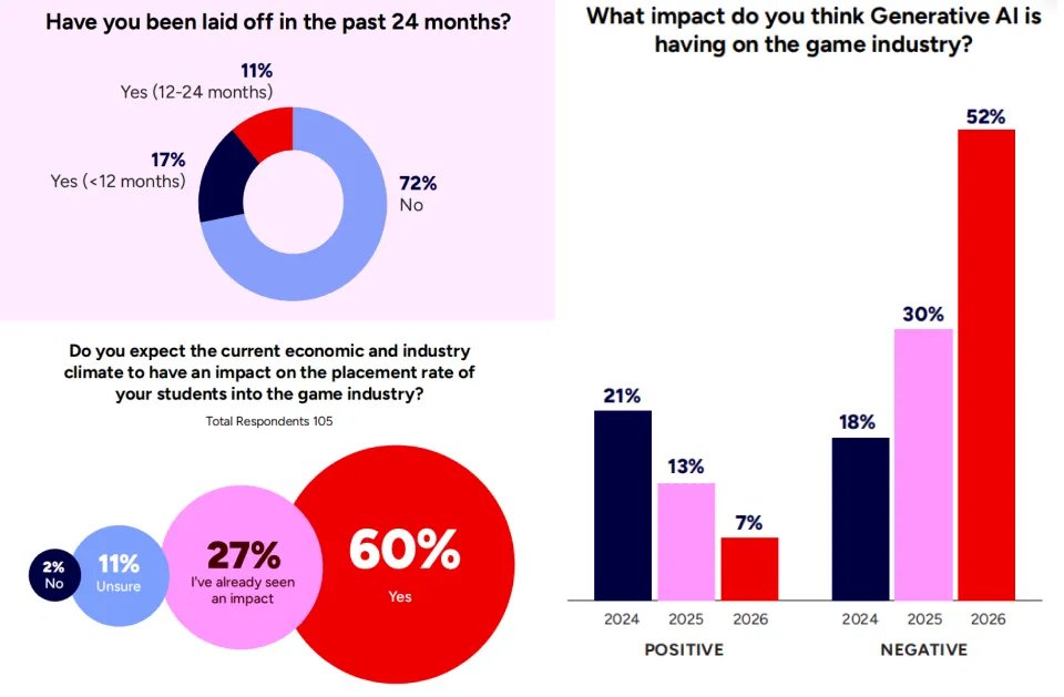 根据 GDC 的官方报告,超过 28% 的从业者在过去两年经历过裁员,高达 74% 的相关专业学生对就业前景感到焦虑;与此同时,超过一半的开发者对 AI 进入游戏开发持负面态度,但 AI 工具的实际使用率却持续走高。