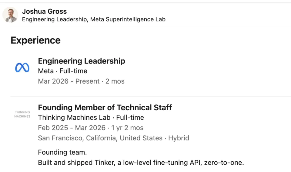 资深软件工程师约书亚·格罗斯(Joshua Gross)亲手把Thinking Machines Lab的旗舰产品Tinker从零做到交付,上个月正式加入Meta Superintelligence Labs,领导整个工程团队。