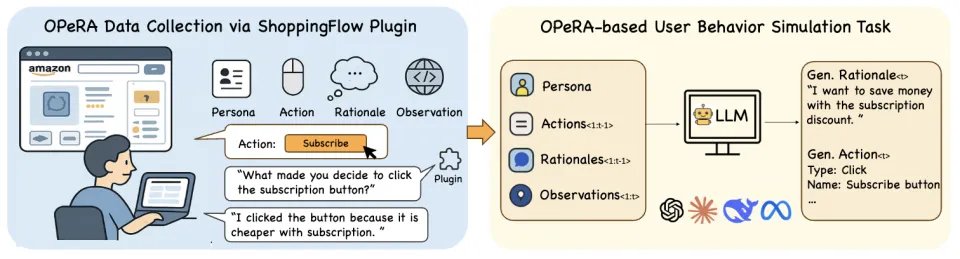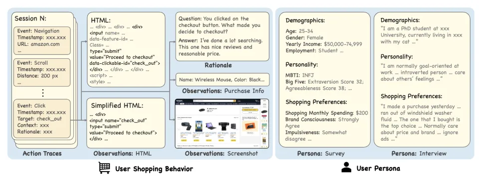 基于上述思考,该工作提出了 OPeRA(Observation, Persona, Rationale, Action)dataset,一个面向人类行为模拟的真实数据集及评测框架。OPeRA 选择在线购物(online shopping)作为研究场景,一方面,这一场景天然包含丰富的多步交互与决策过程(如搜索、筛选、对比与购买),能够充分体现人类行为的序列性与条件依赖;另一方面,其具有明确的目标驱动,同时又允许个体差异充分体现。