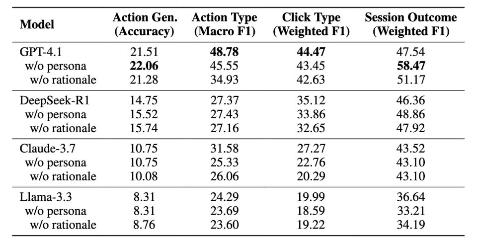 进一步分析发现,不同输入信息对模型表现的影响具有明显差异。首先,persona 的引入对性能提升并不稳定:虽然在 action type 等粗粒度任务上有所帮助,但对最终 action 预测准确率影响有限,甚至在部分情况下带来噪声。这说明当前模型尚无法有效利用 persona 信息进行细粒度决策建模。相比之下,rationale 对模型更为关键。移除历史 rationale 后,大多数模型在多个指标上均出现明显下降,尤其是在 session outcome 等高层决策任务上。这表明,rationale 作为中间决策信号,可以帮助模型更好地理解用户意图并进行推理。