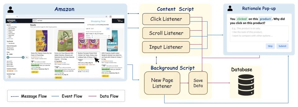 OPeRA 采用了基于浏览器插件的真实用户行为记录方式。研究者邀请参与者在日常在线购物过程中使用定制插件,自动记录其在网页中的交互行为,包括点击、搜索、页面跳转等操作,从而获取完整的 step-wise 行为轨迹。同时,在关键决策节点,系统会以轻量化的弹窗方式提示用户输入当前操作的原因,以实时的形式收集对应的 rationale,避免事后回忆带来的偏差。此外,研究者通过问卷与访谈收集用户的 persona 信息,包括人口统计特征、购物习惯与偏好等。