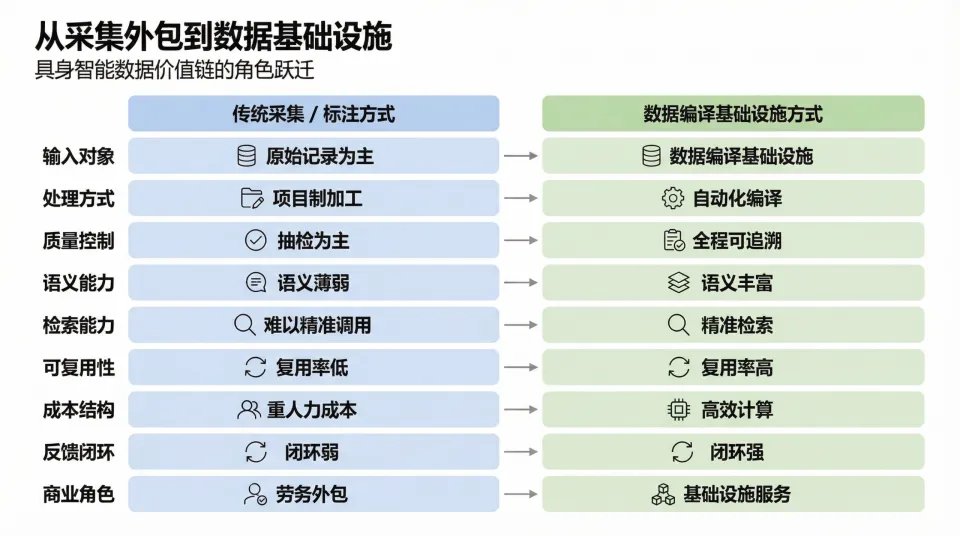 就像操作系统为硬件和应用之间搭好了接口,这个编译层也在为物理世界和模型、本体能力之间定义一套「编译器」般的标准。这可不是简单的采集外包,而是工业体系的构建。谁能把这个体系建立起来,谁就有机会成为模型训练上游的「能力入口」,从低附加值的劳务角色,跃升为一个更有价值的基础设施层。