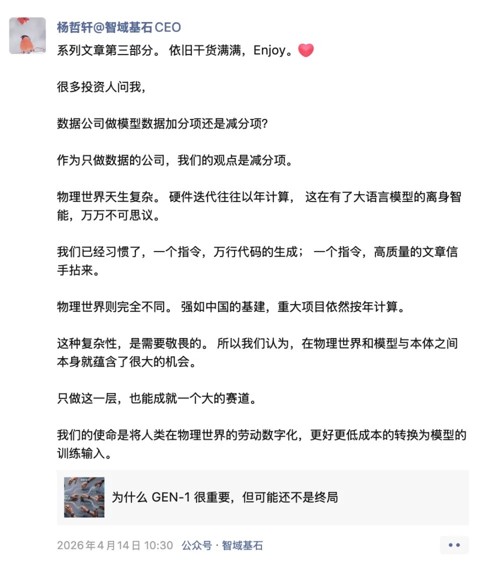 在物理世界、模型与机器人本体之间,搭建一个不同路线最终汇流、且难以绕开的基础设施层。这一层,就是智域基石的机会所在。