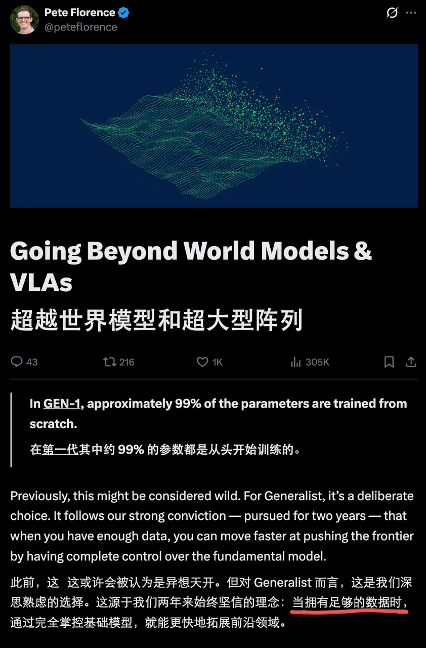 大洋彼岸,近期,Generalist AI 公布了一项引发行业关注的进展:据其公开披露,团队基于约 50 万小时真实世界人类行为数据训练的 GEN-1,在若干任务上的成功率超过 99%。其创始人、前 DeepMind 高级研究科学家 Pete Florence 随后发文表示:「当数据规模足够大,且团队能够完整掌控基础模型时,技术边界会以更快速度被推进。」这被视为其此前关于具身智能尺度定律(Scaling Law)判断的进一步验证。