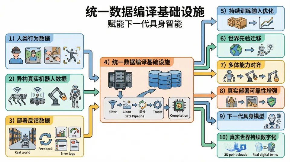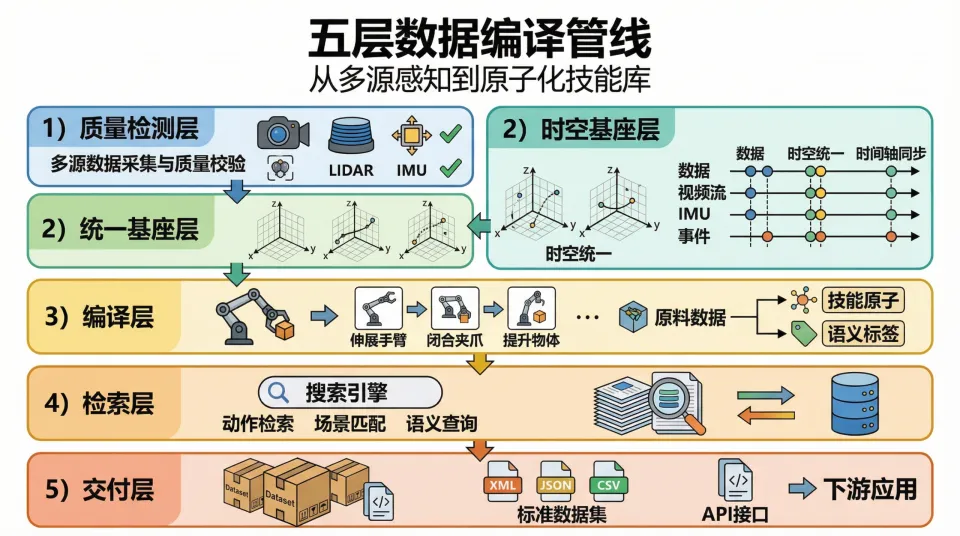 为此,他们提出了「数据编译」的概念。所谓数据编译,就是为物理世界那些高熵、异步、多模态的原始数据,建立一套自动化「精炼管线」—— 去噪、对齐、拆解为「技能原子」,并打上可追溯的语义标签,让算法真正读懂物理规律与动作意图,最后凝结为模型。
