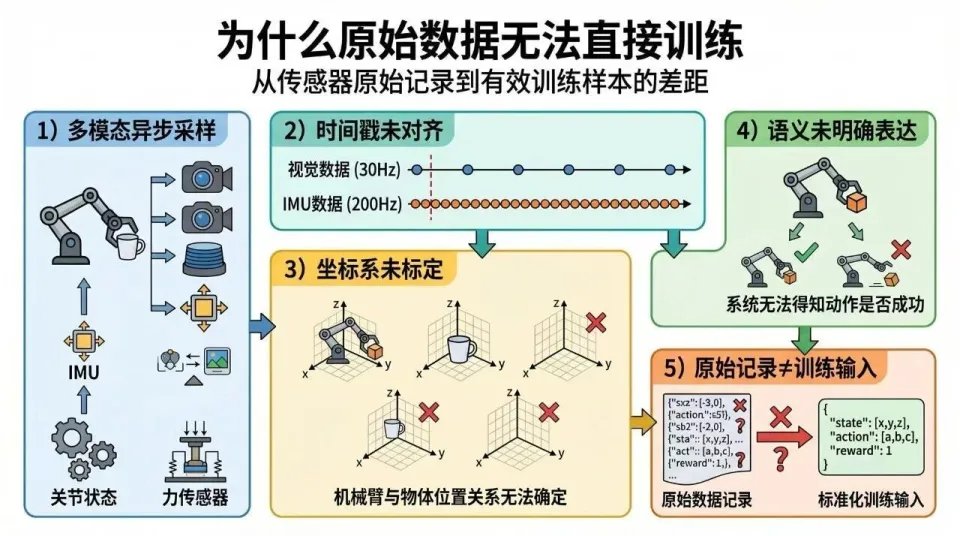首先,机器人数据通常具有多模态、强耦合、异步采样等特点。当手伸向杯子的那一瞬间,摄像头可能以 30Hz 记录画面,IMU 以 200Hz 甚至更高频率输出惯导信息,关节编码器也运行在各自的采样频率与时钟体系下。对于理想中的训练输入,在时间维度上,需要完成多传感器时间戳同步;在空间维度上,则要完成视觉、末端位姿、力觉 / 触觉与关节状态之间的坐标系标定与对齐。否则就会出现「手已经摸到杯子,视觉却显示还有五厘米」的诡异错位。将这种时空错配输入模型,往往会诱导其学习到错误的感知 — 动作映射。