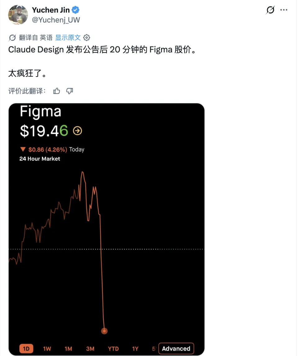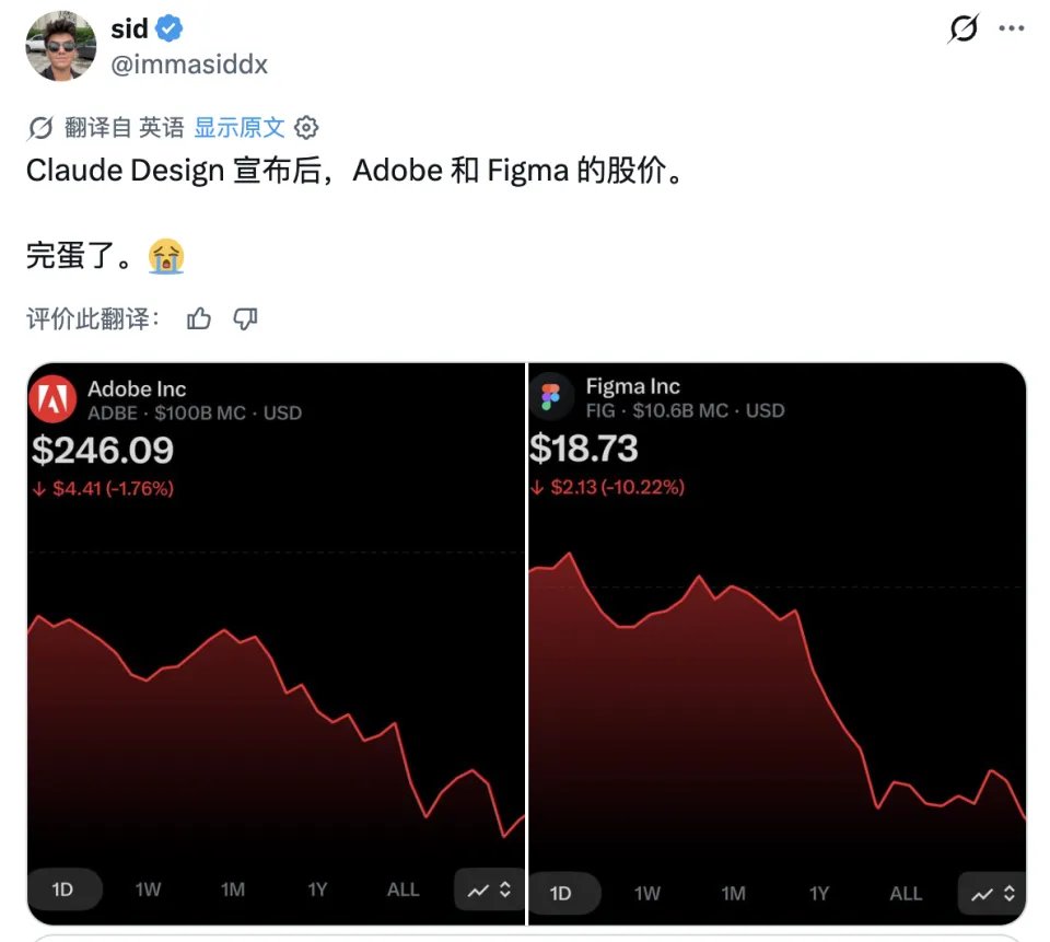 一觉醒来,Claude 还在继续上大分,这一次瞄准的是设计行业。就在刚刚,Anthropic 正式发布 AI 设计工具 Claude Design,相关推文在 X 平台引发超过 1141 万次浏览。过去我们常说,做好一名设计师,你需要熟练掌握各种复杂的软件快捷键,懂得像素级的对齐规范,还要在产品经理和开发工程师的无休止拉扯中艰难生存。而现在,Claude Design 给出了一种极其粗暴且优雅的解法:你只需要会说话。Claude Design 发布不到 20 分钟,Figma 股价开始下跌,Adobe 同样未能幸免。设计即 AI,AI 即设计