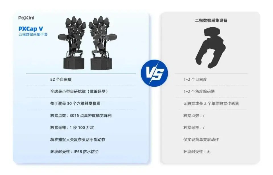 独家 82 高自由度五指动作数据:帕西尼自主研发的 PXCap V,是全球首款实现全五指无盲区触觉覆盖的穿戴式数据采集设备。其内置 30 个六维触觉模组,触觉点数密度高达 3015 个,搭配全球最小型自研抗磁磁编码器,可同步采集 15 种维度的触觉感知信息及手部姿态、关节运动,轨迹重建精度行业领先,可完整还原人类在真实操作中的交互过程,可赋予具身智能体极高的物理一致性与精细度。