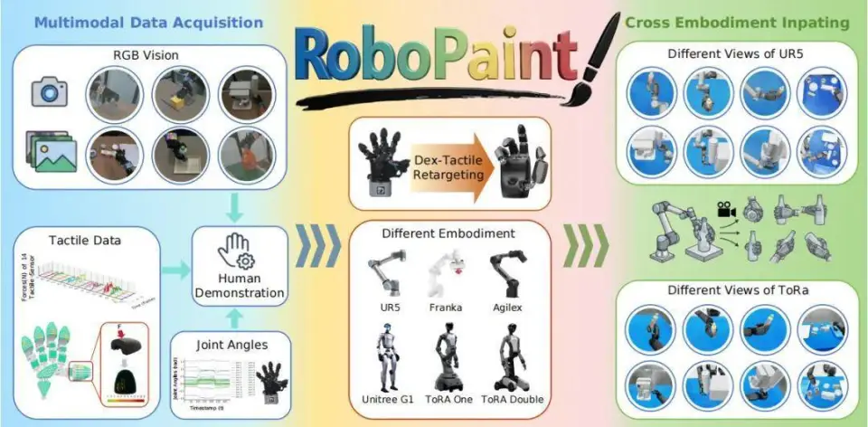 *RoboPaint 数据流程:该数据流程能够基于从人类演示中采集的多模态数据 “绘制” 给具身智能体进行学习。通过 Dex-Tactile 重定向方法,能够有效解决人机之间的跨具身性问题。