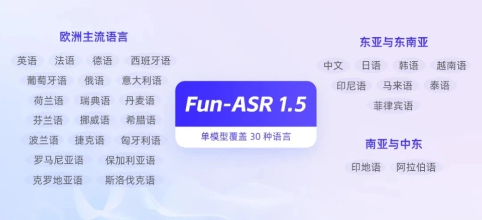 Fun-ASR1.5可精准识别欧洲、东亚、东南亚、南亚及中东主流语种,覆盖中、英、日、韩、法、德、西、葡、俄、阿拉伯语等30种语言。