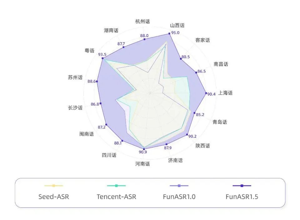 中文方言方面,Fun-ASR1.5则在四川话、闽南话、长沙话、苏州话等13种方言识别准确率上,超越Seed-ASR和Tencent-ASR模型。