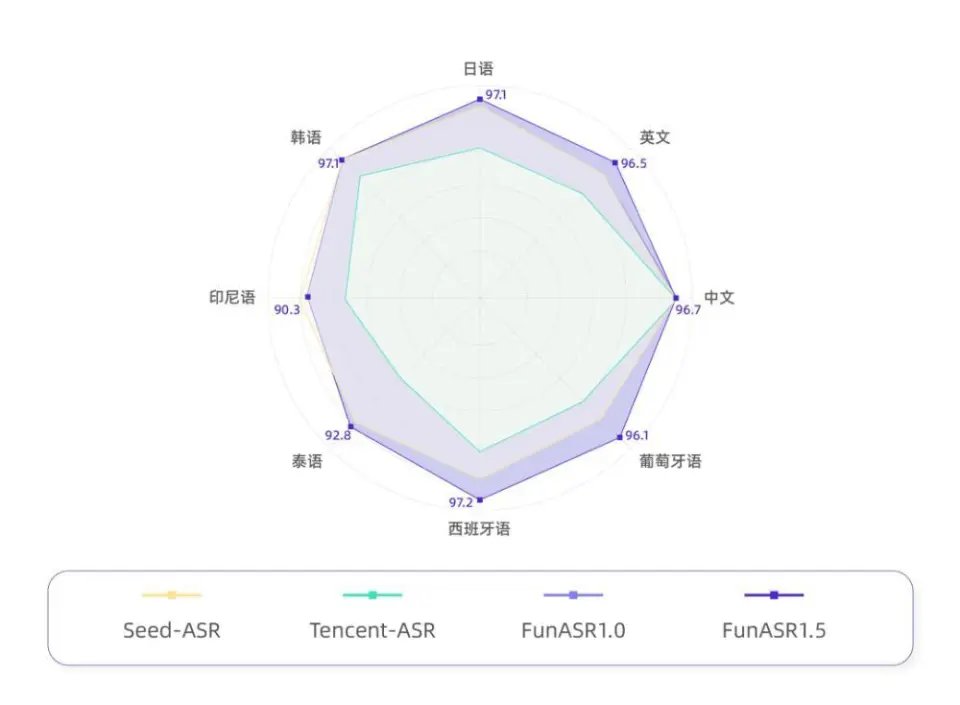 技术团队介绍称,与Seed-ASR和Tencent-ASR模型相比,Fun-ASR1.5在西班牙语、葡萄牙语和英语方面的识别准确率成绩较为突出,均在96分以上。
