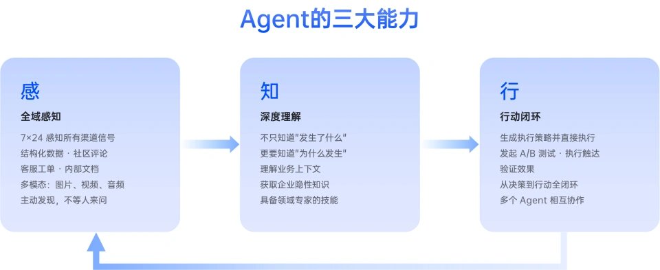 行——行动闭环。 Agent 根据理解生成策略并直接执行。比如,发现某渠道 ROI 持续走低,自动生成缩减预算并重新分配的策略,发起 A/B 测试验证,确认效果后推全量——整个过程无需人工排期。它完成的是从决策到行动的全闭环,而非只输出一份报告等人去执行。