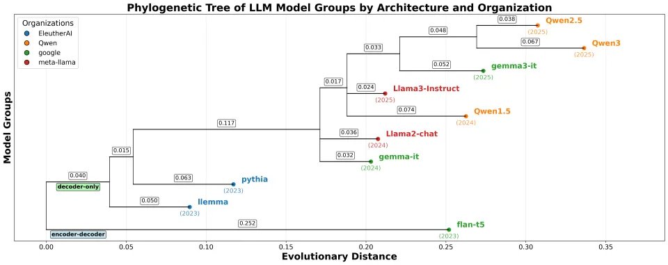 论文确实这么做了。团队基于 DNA 距离构建了系统发育树,结果发现这棵树能够比较自然地反映出一些真实世界中的演化规律:例如从encoder-decoder到decoder-only的整体迁移,不同家族随时间推进的演化,以及像Llama、Qwen、Gemma这样的家族分支结构。论文还观察到,不同家族的「演化速度」似乎也不一样,有些分支变化更快,有些则更平稳。