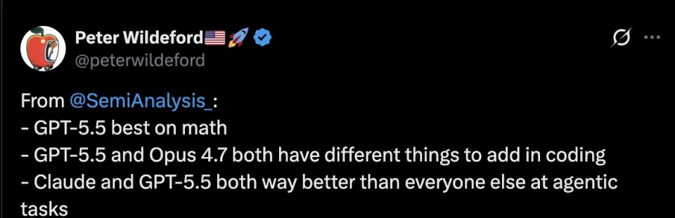测试之后,AI行业分析机构SemiAnalysis坦承:在某些任务上的表现,GPT-5.5已经显著超越了所有其他模型。