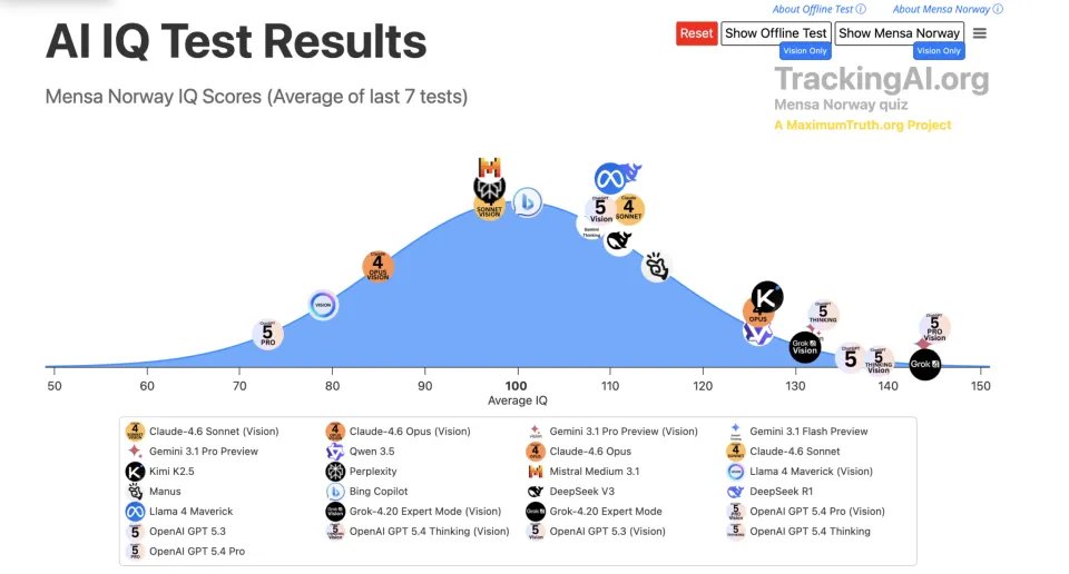 这并非孤例。就在本月初,GPT-5.4 Pro 已经在TrackingAI公开榜单上跑出150 IQ,登顶所有公开IQ跑分。