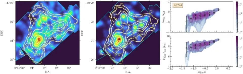 最终,研究团队确定了两组共 9 个与 A2744 构型高度相似的模拟类似体。由于模拟本身只处理暗物质,团队引入了 L-GALAXIES 半解析模型,为这些暗物质的引力骨架填入星系、颜色、光度等物理属性,并模拟出韦布望远镜(JWST)视角的虚拟观测图。结果显示,模拟预测与 JWST 的实际观测在光度函数、质量密度分布等多个维度上表现出惊人的一致性,精细度直达 50 kpc 的空间尺度。