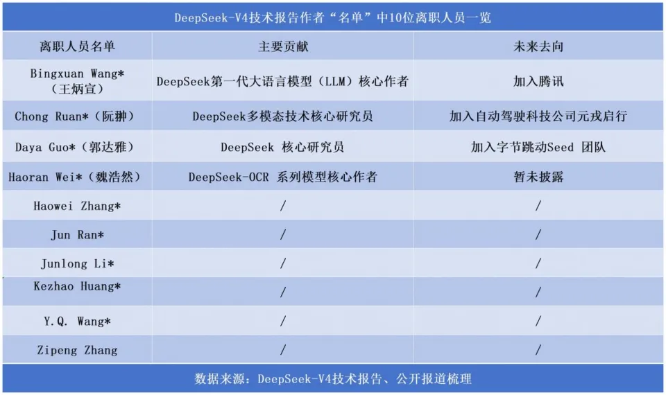 值得关注的是,在 DeepSeek-V4 长达 58 页的技术报告里,官方列出了一份近 300 人的“研究与工程”作者名单。近 300 个名字中,DeepSeek 创始人梁文锋的名字和所有研究员、工程师排在一起;同时,名单中有 10 人标注“已离职”,其中不乏王炳宣、魏浩然、郭达雅等核心骨干成员。