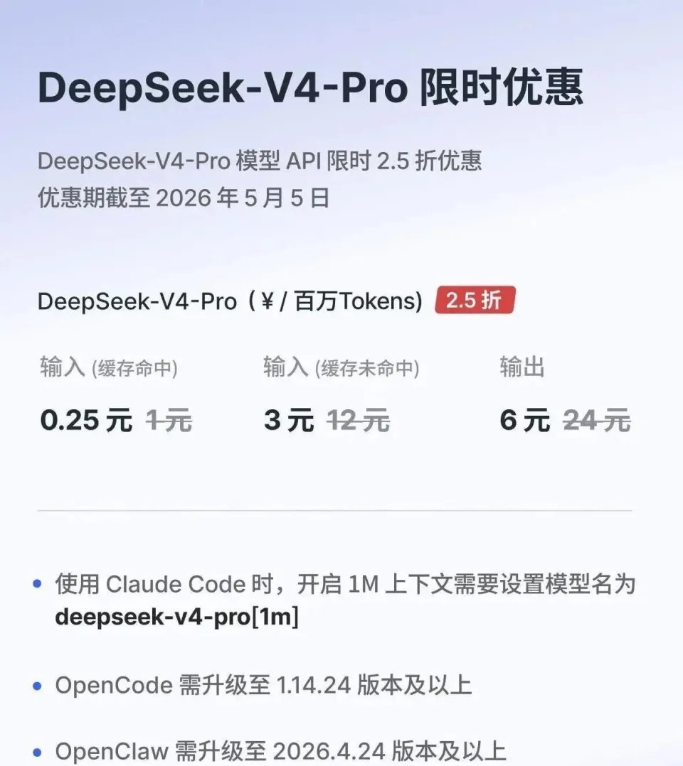 官方 API 文档显示,DeepSeek-V4-Pro 模型 API 限时 2.5 折优惠,优惠期截至 2026 年 5 月 5 日。