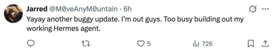 还有人表示,「又是一个全是 Bug 的更新。兄弟们我不陪玩了,我很忙,要去折腾我那个能跑通的 Hermes 智能体了。」
