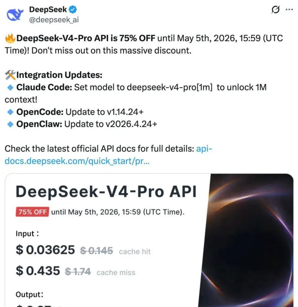 与此同时,DeepSeek 官方更新 API 文档,宣布 DeepSeek-V4-Pro 开启限时 2.5 折优惠,截止日期 5 月 5 日。它也提到 OpenClaw 要升级到最新版本,才能使用最新系列模型。
