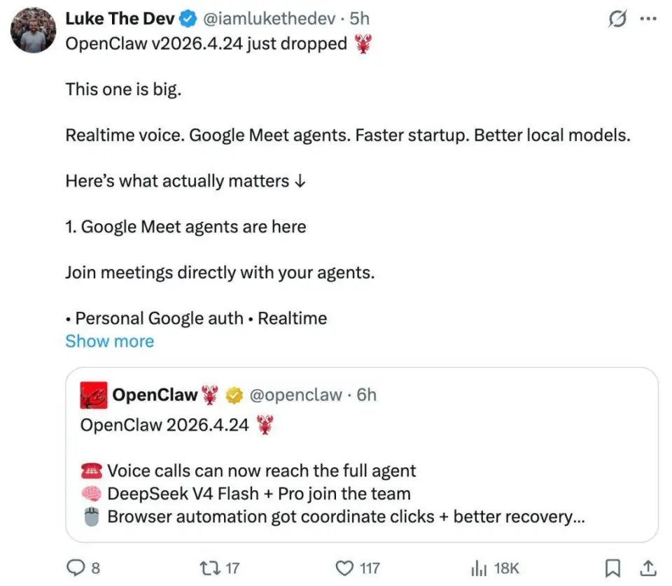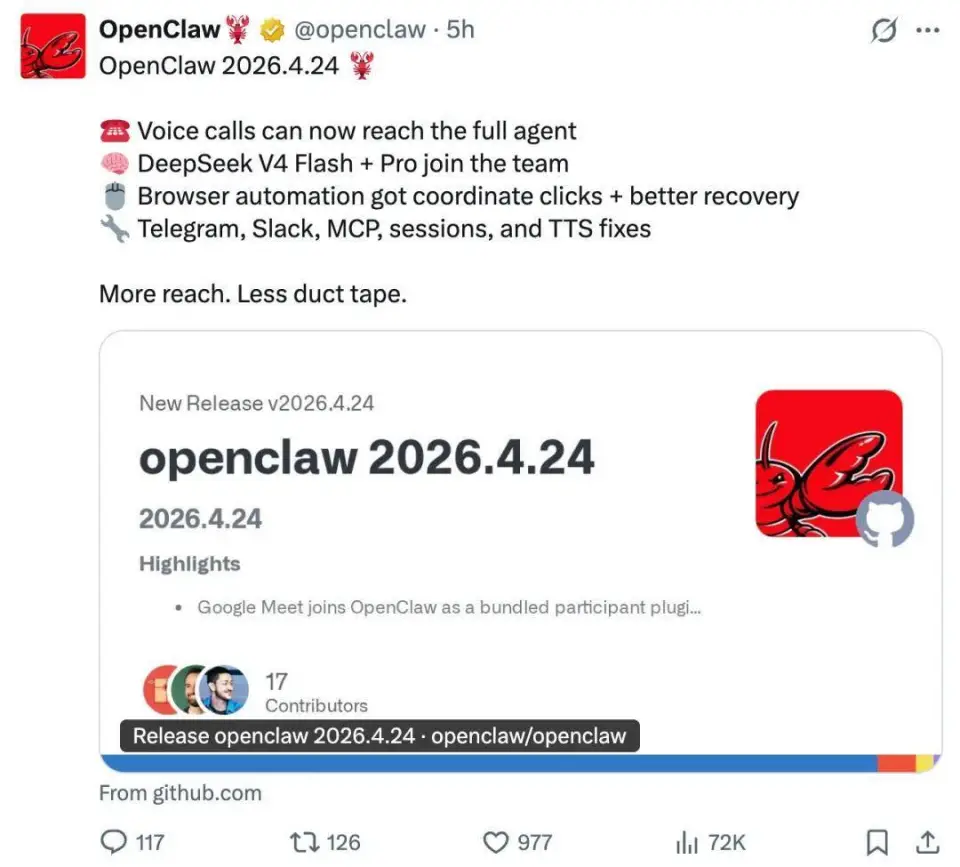 今天凌晨,OpenClaw 发布了「2026.4.24」版本。
