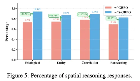 Figure 5显示,引入 S-GRPO 后,模型使用空间信息的比例显著提升。关键不只是更高准确率,而是:模型从「可能不用结构」 → 「主动依赖结构」