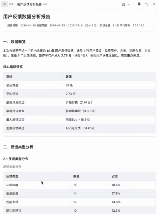 你说「反馈特别多的那种要单独拎出来」,它理解为高频问题提取。你说「有些人就是提个建议,有些是真用着不爽了」,它归纳为情感分类维度,建议类和负面体验类分开处理。