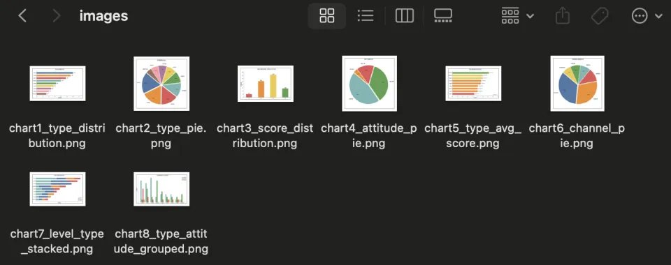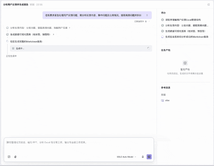 分析用户反馈内容,按问题类型聚类并计算比例,提取高频问题单独标注,区分用户态度,生成含柱状图和饼图的Markdown报告,数据来源为用户上传的附件。