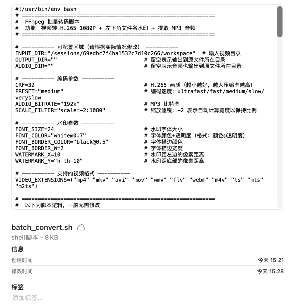 比如「帮我写个脚本调用FFmpeg,把这些视频批量转成H.265的1080p,音频提取出来存成MP3。对了,视频左下角把文件名印上去当水印,省得我弄混。调用那个批量处理的Skill。」