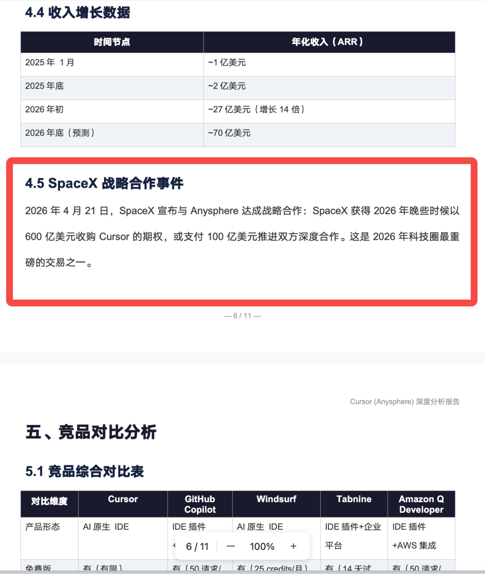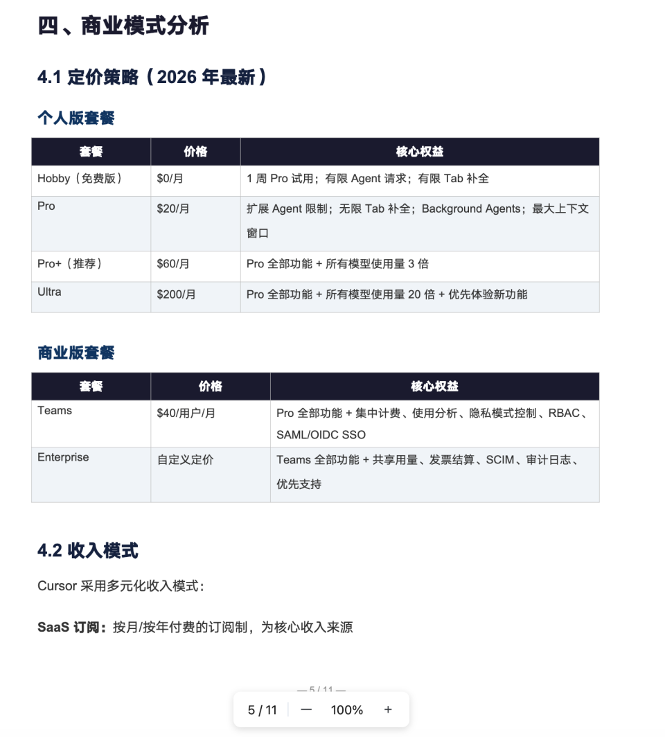 Cursor核心功能/体验/商业模式拆解、3-5个竞品对比表格(含功能差异、用户画像、收费模式、近两版本更新)、壁垒总结与风险建议。