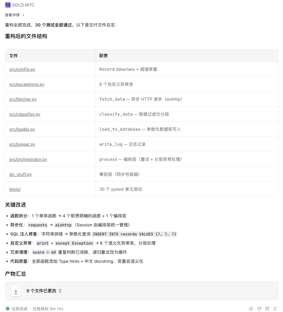 嗯你看一下这段Python代码啊,就是那个do_stuff函数,太乱了真的,啥都塞一块了,帮我重构一下吧。我大概说一下要求哈,先把这个大函数拆开,嗯,拆成三个吧,一个专门负责请求数据的、一个处理数据做分级的、还有一个写数据库加记日志的。不对,日志单独拆出来,拆成四个。就是职责分清楚点,别全堆一起。然后那个错误处理太乱了,到处都是try except和print,统一一下,改成自定义异常往外抛,哦对了,改成async await异步的,requests换成aiohttp那种。还有啊,注释加上,type hints加上,变量名别叫r、d、f这种鬼看得懂的名字,规范一点。那个score > 60写了两遍,SQL拼接也有注入风险,这些冗余的和有问题的逻辑都清理掉,参数化查询搞一下。对了单元测试也补上,pytest就行,差不多就这些。用Plan模式帮我规划一下。