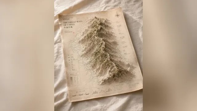一张复古风格的长城地形地图平铺在桌面上,开场时仍然是平面的纸质图纸,纸张微微卷边,光线柔和,带有旧档案地图的质感。随后地图轻微翻动,纸面上的山体和长城缓缓从平面中隆起,变成立体纸雕沙盘。镜头顺势向前推进,沿着长城低空穿梭飞行,掠过城墙、烽火台和山脊,画面重点表现“从纸上长出来的长城”这种感觉。整体不是写实风景,而是复古地图、纸雕模型、微缩沙盘结合的视觉效果。最后镜头缓缓拉远,重新回到俯视角,完整看到整张立体化的长城地图,画面安静、精致,有档案感和历史感。