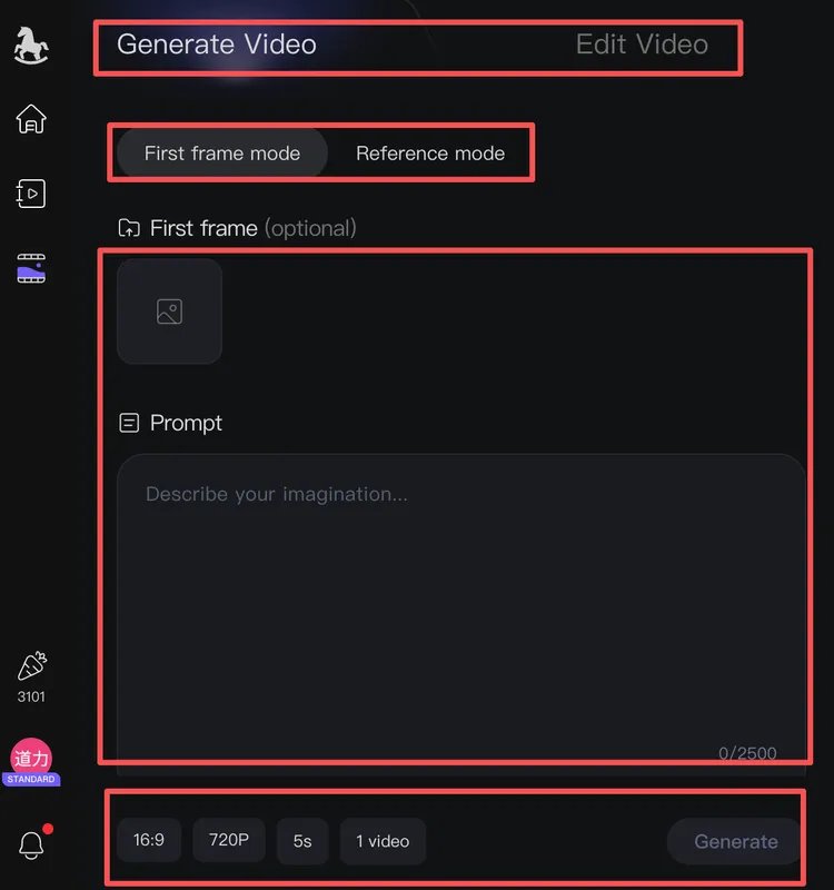 进入 HappyHorse 生成页面,分成两个大功能板块,生成视频和编辑视频。