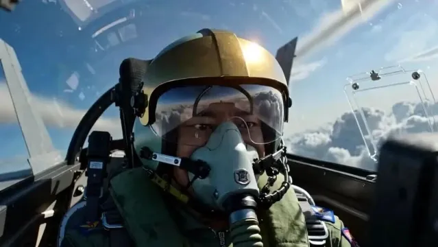 切入飞行员侧脸特写,展现飞行员在高 G 过载下紧张而专注的反应;手部快速操作推杆、开关、按钮和档位控制器。随后镜头迅速切回战机外部,机翼划破气流,强烈风噪呼啸而过,发动机轰鸣震撼。