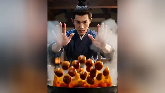 一位身着中式服饰的人物站在中式厨房灶台前,以武侠功夫烹饪“宫保鸡丁”。整体画面流畅连贯,强调剧情推进、动作节奏与食材特写,镜头语言丰富,包含近景、中景、特写与动态跟拍,突出中式功夫与烹饪结合的视觉冲击力。