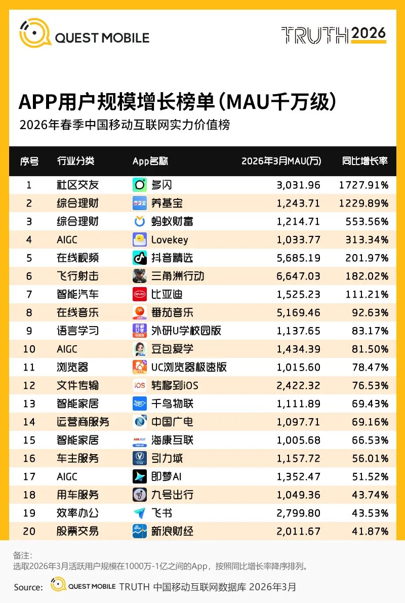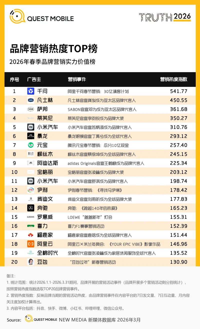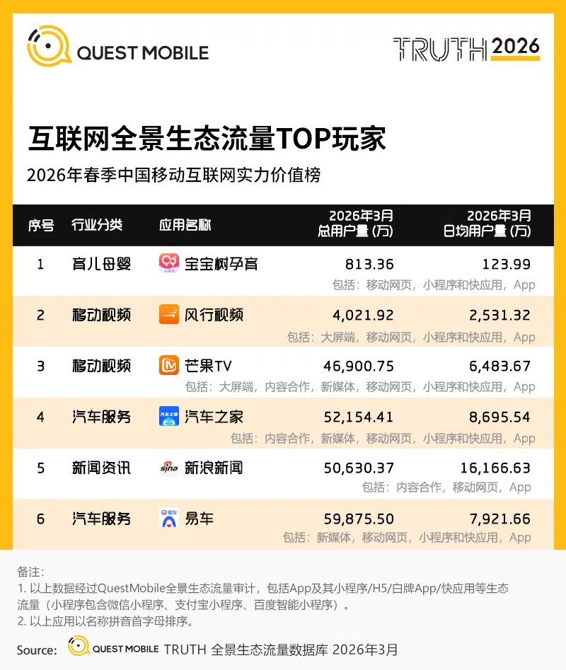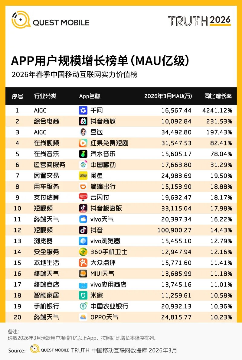 QuestMobile2026年春季中国移动互联网价值榜
