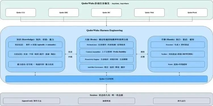 这种自我修正,不只发生在记忆层面。QoderWake 的进化是多维的:记忆进化让它越用越懂你,技能进化让它越用越知道哪些工具有效,流程进化让它越用越懂团队,组织进化让它越用越懂公司。四个层次叠在一起,才构成真正的岗位级成长。